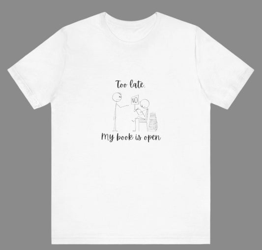 too late my book is open Unisex Fun Reading Tee, Book Lover Shirt, Open Book T-Shirt, Literature Gift, Casual Literary Apparel