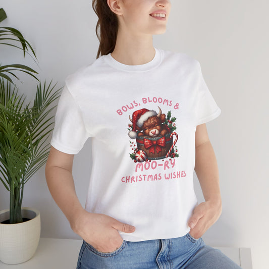 Bows, blooms, and Moo-ry Christmas Wishes T-Shirt, Unisex Short Sleeve Tee, Holiday Gift, Fun T-Shirt, Seasonal Apparel, Unique Christmas Design