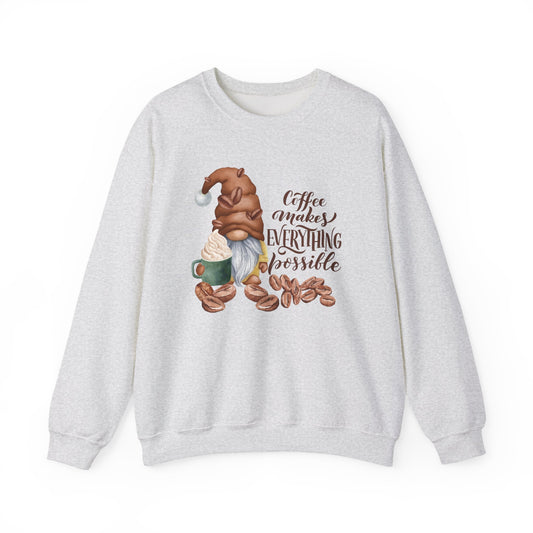 Coffee Makes Everything Possible Sweatshirt, Cozy Gift for Coffee Lovers, Fall Fashion, Gnome Design, Unisex Crewneck Sweatshirt, Perfect